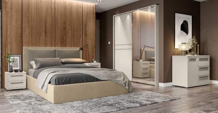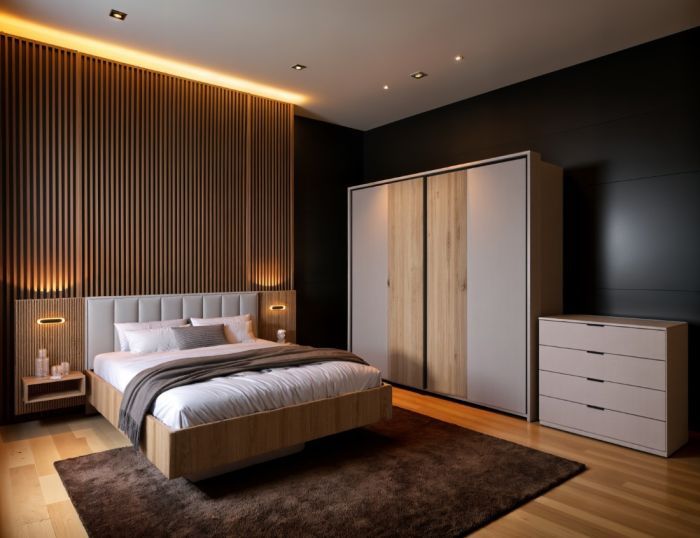 - LED osvetlitev ali diskretne svetilke ob postelji ustvarijo prijetno vzdušje in omogočajo funkcionalno svetlobo za branje ali sprostitev.