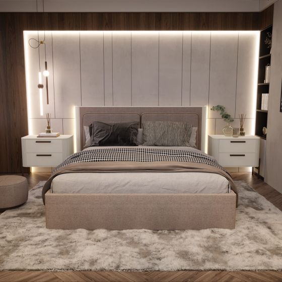 Spalnico iz kolekcije RONDO. Komplet vsebuje posteljo, dve nočni omarici in štiridelno omaro z notranjo LED osvetlitvijo, s steklenimi vrati in dvojimi polnimi. Premium kolekcija RONDO prinaša osvežujoč pristop k oblikovanju interierja s skrbno izbranimi materiali in sodobnimi linijami. Rondo je kolekcija, ki bo v vaš prostor vnesla dinamiko in pravo osvežitev. Navdihujoča zasnova omogoča opremljanje različnih tipov prostorov, bodisi modernih interierjev ali tistih z rustikalnim šarmom. Spalnica Rondo zagotavlja popolno ravnovesje med estetiko in funkcionalnostjo ter omogoča, da vsak prostor zasije v svojem polnem sijaju. Spalnica kolekcije Rondo je na voljo v prefinjeni barvi kašmir z mehkim mat učinkom in zagotavlja popolno mešanico elegance in naravne estetike. S širokim izborom elementov je vsak kos zasnovan za maksimalno funkcionalnost. Posebno pozornost pritegnejo zaobljene rebraste letve, ki dodatno poudarijo obliko. Poleg tega mehanizem za mehko zapiranje omogoča tiho in nadzorovano zapiranje, kar zagotavlja ne le estetiko, ampak tudi maksimalno funkcionalnost.